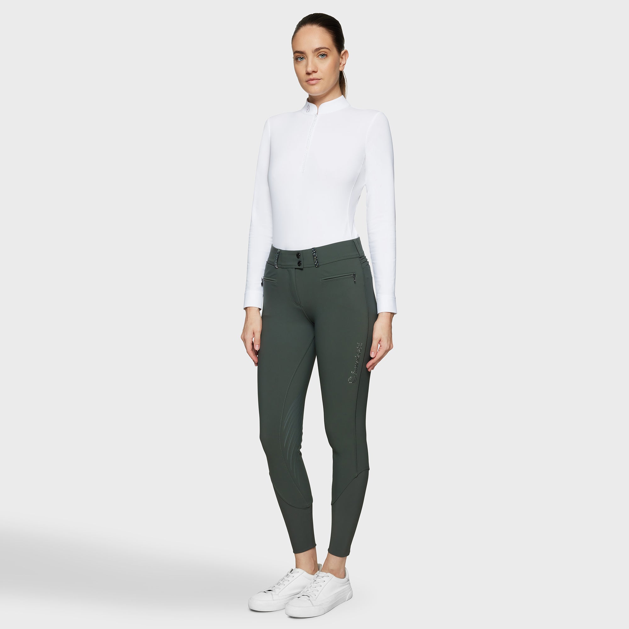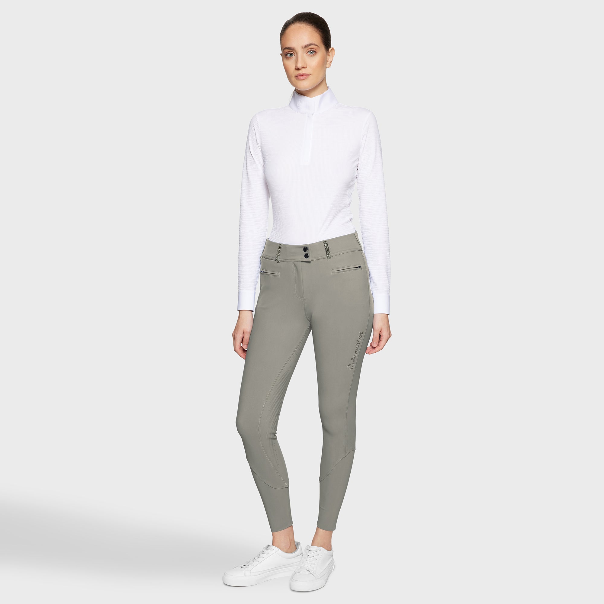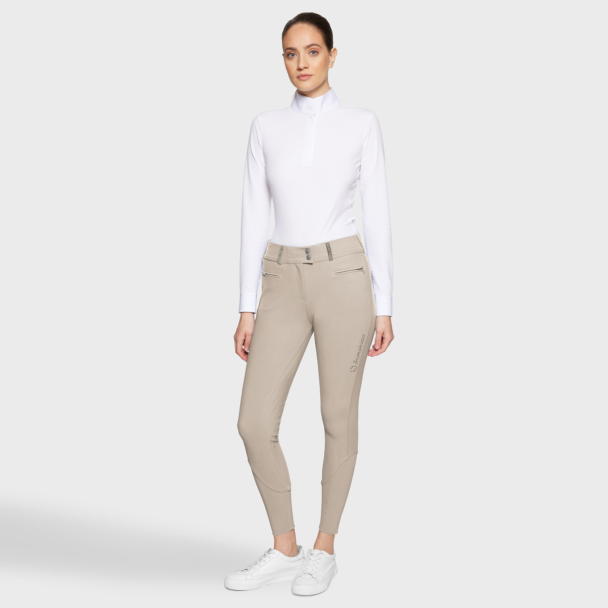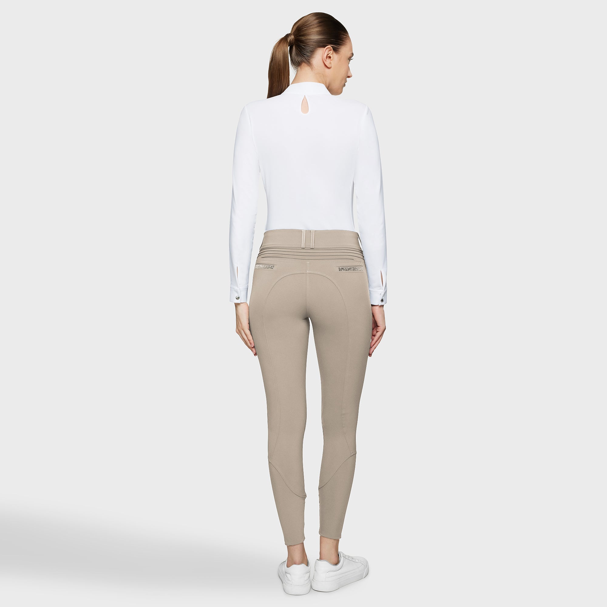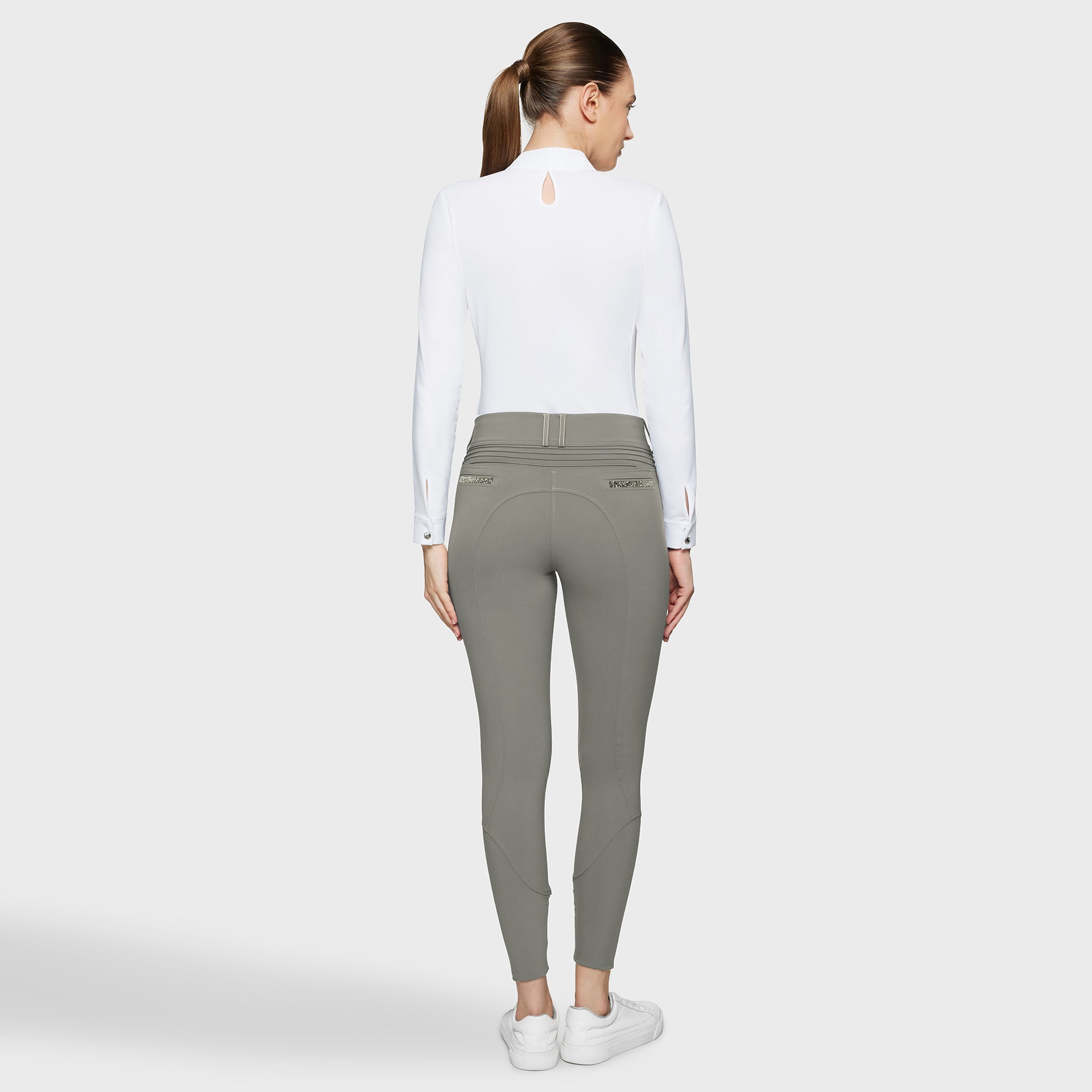 Clara Premium women's high-waisted riding breeches with grip. Designed for riders looking for a functional style with crystals, these pants combine a second skin effect, resistance and performance for all disciplines.