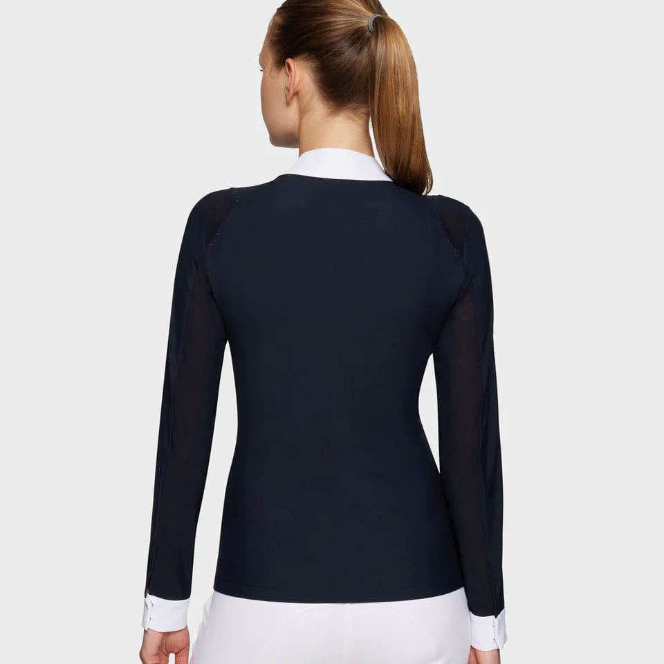 Constructed with ultra-light, four-way stretch fabric and strategically placed mesh panels, this shirt promotes optimal airflow while wicking away moisture — perfect for long training sessions or warm show days.